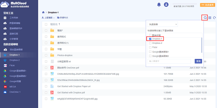 選擇雲端服務的搜尋範圍,然後輸入要搜尋的關鍵詞。例如“file”,點選放大鏡圖標,它將顯示所有檔案名中包含“file”的檔案。
