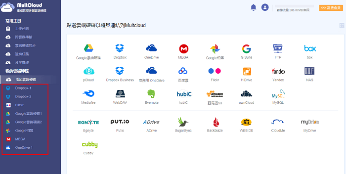 MultCloud支援Dropbox,OwnCloud,WebDAV,Google Drive,MEGA等近30種當前流行且安全的雲端硬碟。