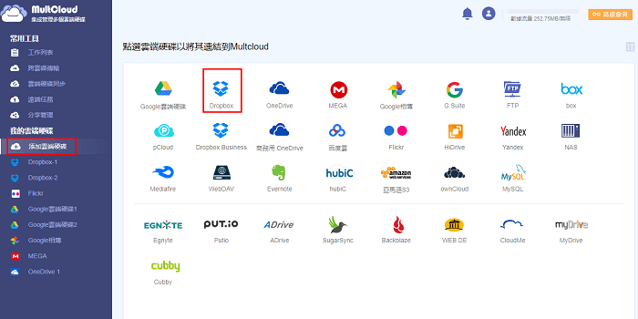 點選“添加雲端硬碟”,然後選擇要添加的雲存儲服務。 例如,選擇“ Dropbox”將連接器添加到MultCloud。