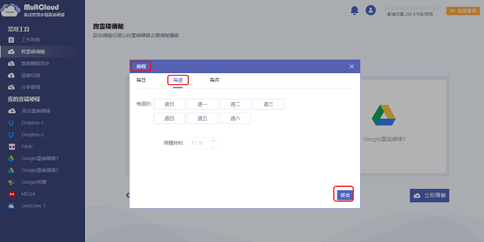 在此界面上,您可以定期安排雲之間的傳輸、備份或同步資料。在這裡,我們嘗試選項卡——“每週”,然後點選“保存”。