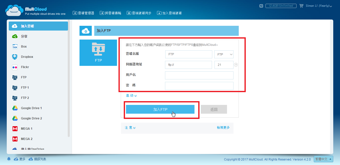 步驟1:首先註冊MultCloud帳號, 之後輸入您的FTP伺服器地址、用戶名稱以及密碼,將您的FTP伺服器連入MultCloud。