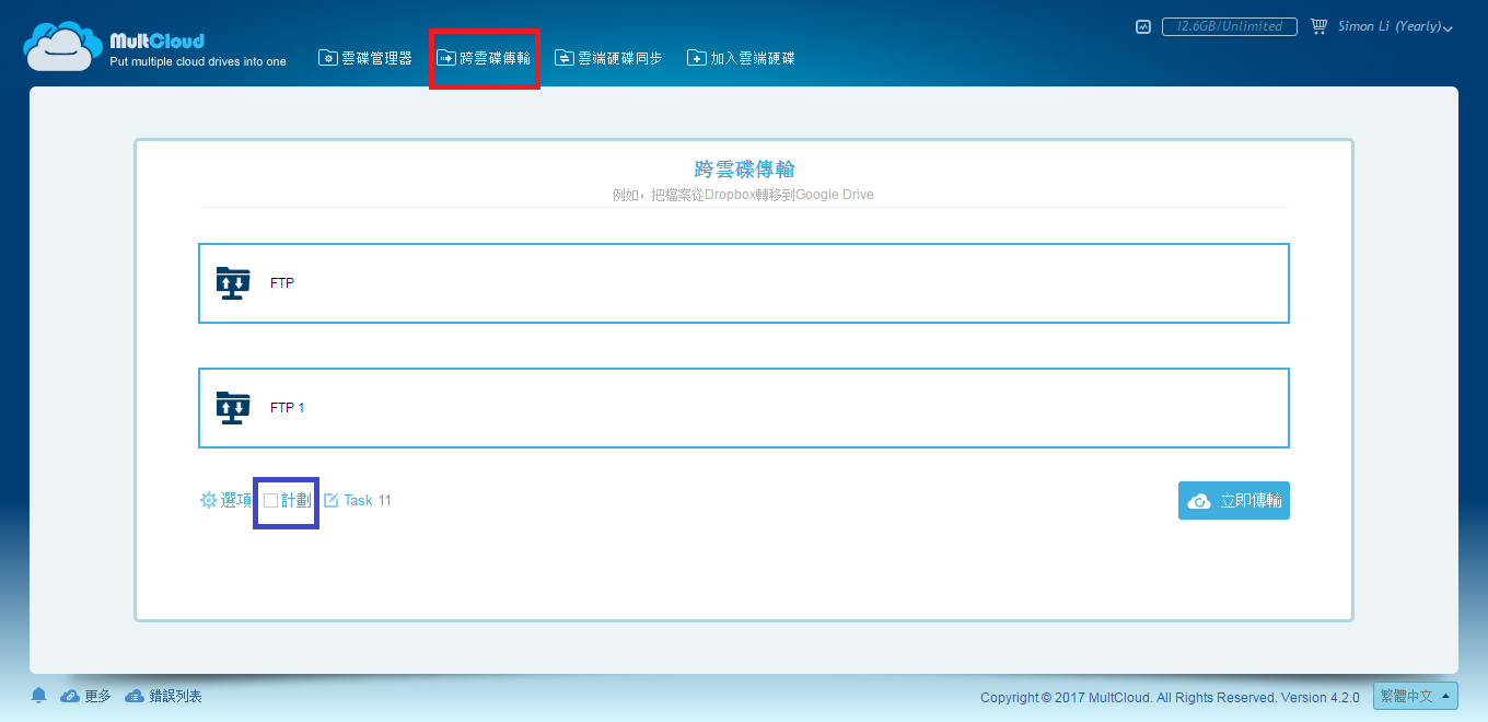 進入“跨雲碟傳輸”介面,按下“計劃”,預設排程,建立一個定時跨平台資料傳輸任務。屆時MultCloud會自動將一個FTP伺服器的資料複製到另一個FTP。