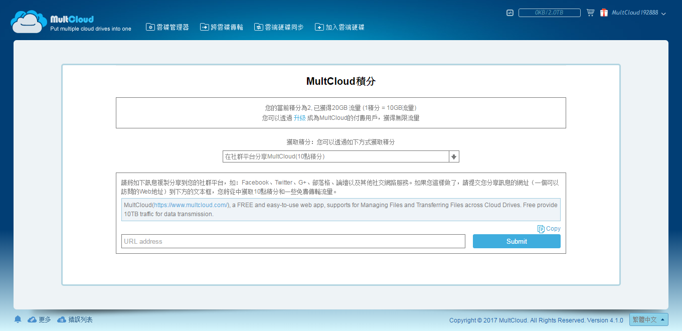 小貼士: 現在您只要一旦註冊即可立即獲取2TB檔案存取流量,並且積極參與MultCloud的各類活動,還能免費獲取大量活動積分,輕鬆兌換成數百GB的檔案存取流量,更重要的是,MultCloud不會對用戶參與活動贏取的積分進行任何限制,實現真正完全免費!