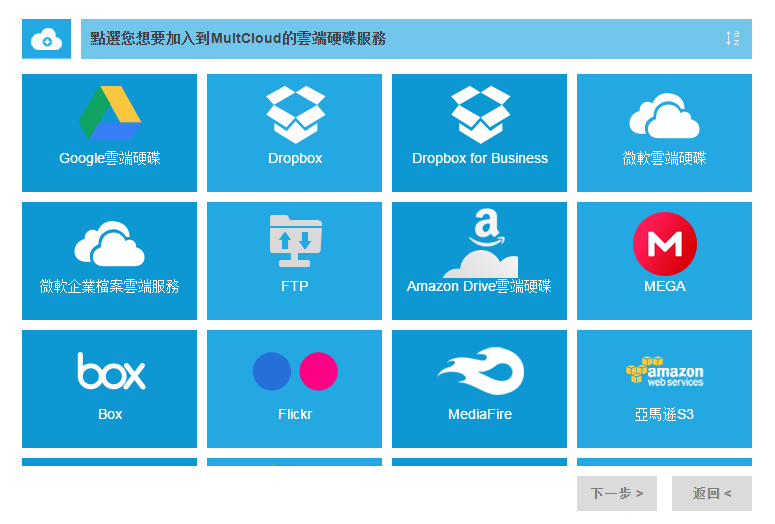 接著就需要將您的雲端硬碟服務與MultCloud建立連接。MultCloud對於您連入的雲端硬碟帳號數量沒有任何限制,所以您可以加入無數多個雲端硬碟服務帳號到MultCloud。隨著您不斷加入新的免費雲端存儲空間,您將不斷增加雲端硬碟容量,從而實現免費雲端空間無限容量。
