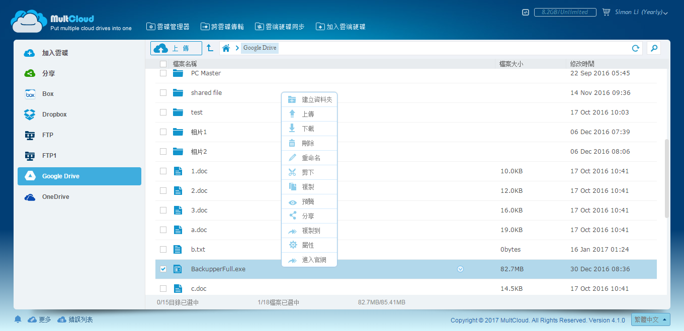 之後,您可以透過MultCloud介面查看並您的所有檔案。只需右鍵點擊您想要操作的檔案,就可以打開操作選單。