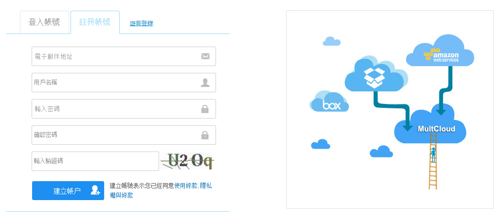 下面我們就透過一個實際例子,來看看MultCloud是如何讓您獲取額外免費雲端硬碟容量的。首先請免費註冊MultCloud 輸入您的信箱、帳號、密碼、重複密碼和驗證碼,即可完成註冊。之後請到電子郵件信箱中收取並確認MultCloud驗證信件。最後登入MultCloud。